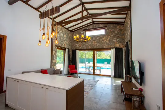 Kayaköy'ün eşsiz doğasına sırtını yaslamış; doğa içinde dingin konumu ve yemyeşil geniş bahçesiyle sakin ve huzurlu bir tatil arayan misafirlerimiz için oldukça uygun olan villa, sizlere Kayaköy'ün büyülü tarihinde kısa bir mola vaadetmektedir. Bu bağlamdan esinlenerek dizayn edilmiş bahçe alanı geniş havuz terasında sahiptir; yine havuz terasında kapasiteye uygun şezlong takımı, konforlu oturma grubu, salıncak ve barbekü bulunmaktadır. Havuz terasına açılan konforlu oturma odası, donanımlı mutfağıyla herhangi bir şeyin eksikliğini hissetmeyeceğiniz villanın, bir yatak odasında çift kişilik yatak ebeveyn banyosu , ikinci yatak odasında da iki tek kişilik yatak ve ebeveyn banyosu bulunmaktadır.