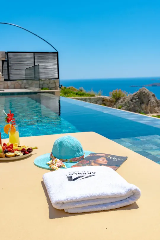 Salon: Villanın eşsiz deniz manzarasını seyredebileceğiniz bu salonda lüks bir oturma odası, TV, klima, sehpa, yemek masası, lavabo ve tuvalet yer almaktadır. Ayrıca salondan havuz terasına çıkış mevcuttur.
