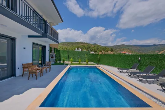 Merkezi konumu sayesinde tercihlerin başında gelen villa, oldukça ferah ve geniş bahçe alanında kapasiteye uygun şezlong takımı, oturma grubu, salıncak ve barbekü alanına sahiptir. Havuz terasına açılan zevkle döşenmiş konforlu oturma odası ve tam donanımlı mutfağı, her iki yatak odasında da çift kişilik yatak ebeveyn banyosu; üçüncü yatak odasında iki tek kişilik yatak ve ebeveyn banyosu bulunmaktadır. İç mekan yapısı ve donanımları da en az dış mekan kadar ferah, modern ve konforunuz ön planda tutularak oluşturulmuştur.