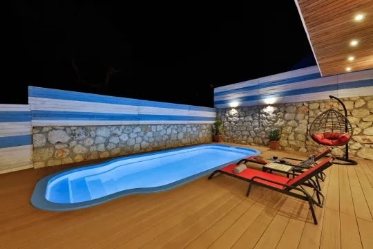 Kalkan İslamlar mevkiinde bulunan villa 1 yatak odasıyla 2 kişilik konaklama kapasitesine sahiptir. Korunaklı havuz ve bahçe alanına sahiptir. Balayı çiftleri için oldukça uygundur.