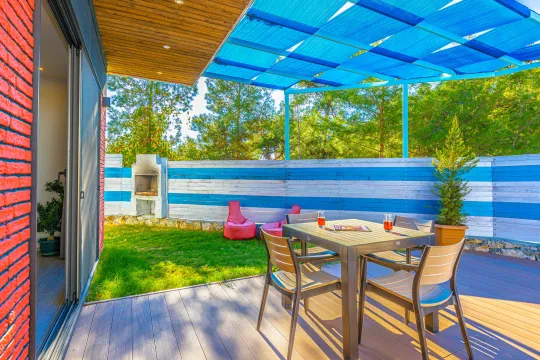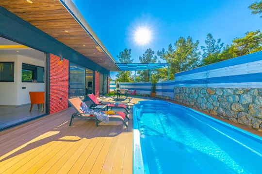 Geniş havuz ve bahçe alanına sahip villada, kapasiteye uygun oturma alanı, şezlong takımı, barbekü, hamak;konforunuz gözetilerek tasarlanmış olan muhafazakar havuz alanına açılan ferah oturma odası, tam donanımlı açık mutfak; yatak odasında çift kişilik yatak, jakuzi alanı ve ebeveyn banyosu bulunmaktadır. Villa, ihtiyaçlarınıza tam karşılık verecek donanıma sahiptir.