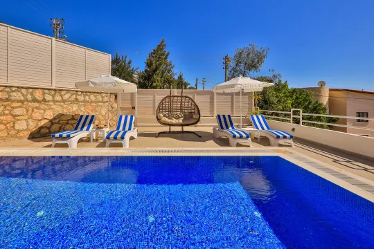 Bahçe : Villanın bahçesinde özel yüzme havuzu, güneşlenme terası, güneş şemsiyesi, şezlonglar, bahçe yemek masası ve sandalye, bahçe oturma grubu bulunmaktadır.