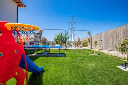 Doğa içerisindeki konumu sayesinde şehir hayatından uzak sessiz, sakin bir tatil geçirebilirsiniz. Ayrıca villamızda siz değerli misafirlerimiz için bulunan masa tenisi, okey takımı, tavla ve çocuk oyun alanı sayesinde keyifli vakit geçirebilirsiniz.Villamızda üç yatak odası üç adet banyo bulunmaktadır. Villamızın üç yatak odası içerisinde de bir adet çift kişilik yatak, klima ve banyo bulunmaktadır. Salon içerisinde mutfak, oturma grubu, televizyon ve klima mevcuttur.