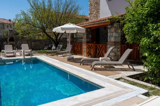 Merkezi konumu sebebiyle de popüler seçenekler arasında yer almaktadır. Gün içinde dilerseniz güneşin tadını çıkarıp havuz keyfi yapabileceğiniz gibi dilerseniz de rahatlıkla eşsiz plaj ve koyları ziyaret edebilirsiniz. Kapalı havuzu ve jakuzisi ile 12 ay tatil yapma imkanı tanımaktadır.Havuz ve bahçe alanına açılan salonu ve tam donanımlı açık mutfağı bulunmaktadır. İki yatak odasında çift kişilik yatak ve ortak banyo; üçüncü yatak odasında çift kişilik yatak ve ebeveyn banyo ; dördüncü yatak odasında ise iki adet tek kişilik yatak ve ortak banyo bulunmaktadır. Ayrıca eğlence merkezleri ve restaurantlara da yakın olan villamız tatil beklentilerinize cevap verebilecek seçeneklerimizdendir. Ailelerin oldukça konforlu bir tatil geçirebileceği donanımlara sahiptir.