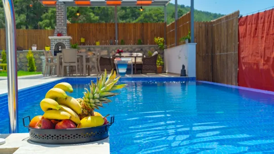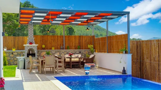 Çam ağaçlarıyla çevrelenmiş, Kayaköy'ün eşsiz doğasına sırtını yaslamış; doğa içinde dingin konumu ve yemyeşil geniş bahçesiyle sakin ve huzurlu bir tatil arayan misafirlerimiz için oldukça uygun olan villa, sizlere Kayaköy'ün büyülü tarihinde kısa bir mola vaadetmektedir. Bu bağlamdan esinlenerek dizayn edilmiş bahçe alanı geniş havuz terasında sahiptir; yine havuz terasında kapasiteye uygun şezlong takımı, konforlu oturma grubu, salıncak ve barbekü bulunmaktadır.