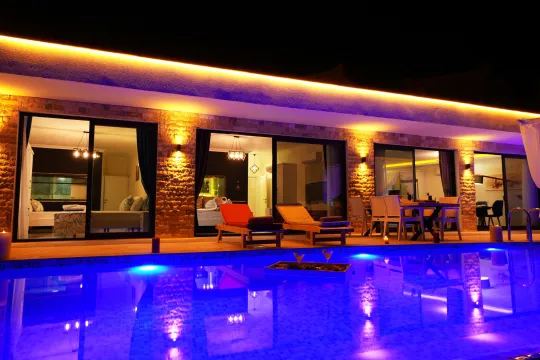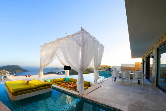 Kalkan, Merkez mevkiinde bulunan 2 yatak odalı ve 4 kişilik konaklama kapasitesine sahip lüks bir villadır. Eşsiz deniz manzarası ve korunaklı yapısıyla villa; muhafazakar çift ve aileler, balayı çiftleri ve çekirdek aileler için uygun bir villadır.