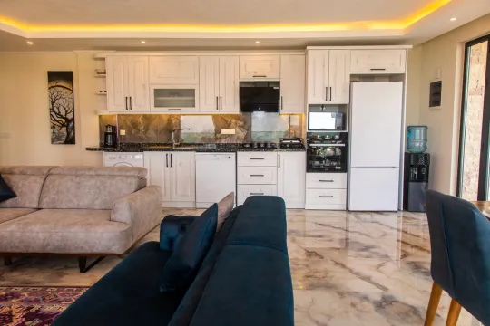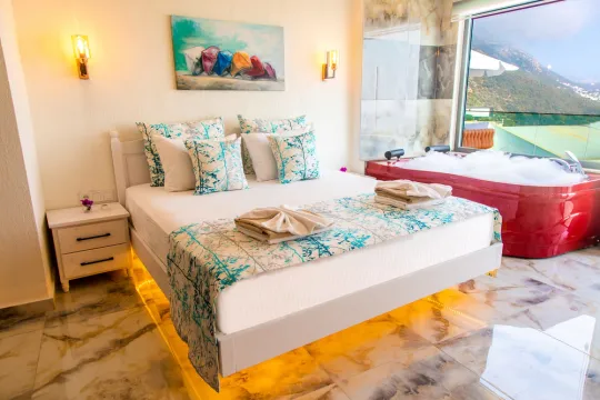 Eşsiz deniz manzarası ve şık tasarıma sahip villa bünyesinde kapasiteye uygun mobilyalar, ihtiyacınız olan tüm araç-gereçleri barındıran Amerikan tarzda, modern mutfak ve 2 adet yatak odası mevcuttur. Konforunuz odaklı tasarlanan villanın tüm yatak odalarında klima ve özel kullanım banyo/wc bulunmaktadır. Ayrıca villanın ebeveyn yatak odasında günün yorgunluğunu atmanızı ve tatilin keyfini çıkarmanızı sağlayacak 1 adet jakuzisi de bulunmaktadır. Villanın korunaklı havuz terası ve bahçesinde kapasiteye uygun şezlong ve şemsiye, oturma alanı, yemek masası ve barbekü alanı bulunmaktadır.