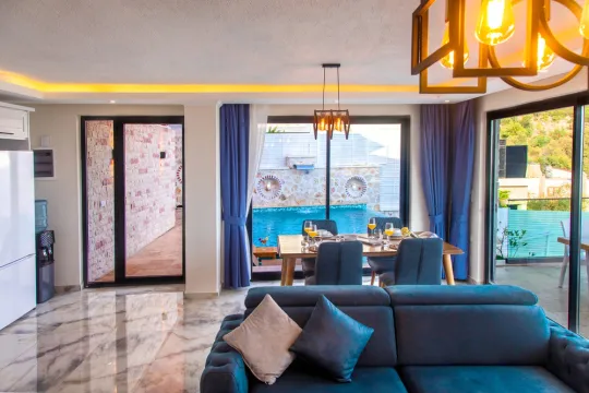 Kalkan, Merkez mevkiinde bulunan 2 yatak odalı ve 4 kişilik konaklama kapasitesine sahip lüks bir villadır. Eşsiz deniz manzarası ve korunaklı yapısıyla villa; muhafazakar çift ve aileler, balayı çiftleri ve çekirdek aileler için uygun bir villadır.