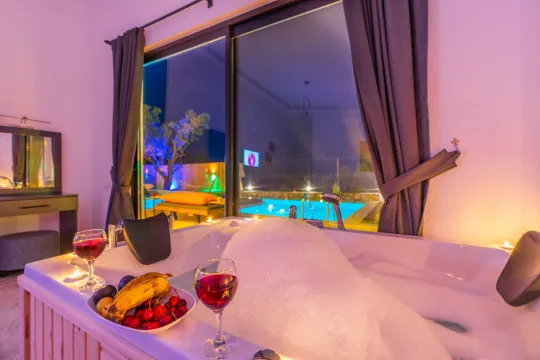 Ferah bir yapıya sahip villa bünyesinde kapasiteye uygun mobilyalar, ihtiyacınız olan tüm araç-gereçleri barındıran modern mutfak ve iki adet yatak odası mevcuttur, odaların ikisinde de jakuzi bulunmaktadır. Konforunuz odaklı tasarlanan villanın tüm yatak odalarında klima ve özel kullanım banyo/wc mevcuttur. Villanın korunaklı havuz terası ve müstakil bahçesinde yine kapasiteye uygun şezlong ve şemsiye, oturma alanı, yemek masası ve barbekü alanı bulunmaktadır. Keyifli zaman geçirmeniz için masa tenisi,langırt,çocuk oyun parkı ve hamak mevcuttur.