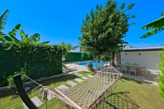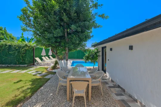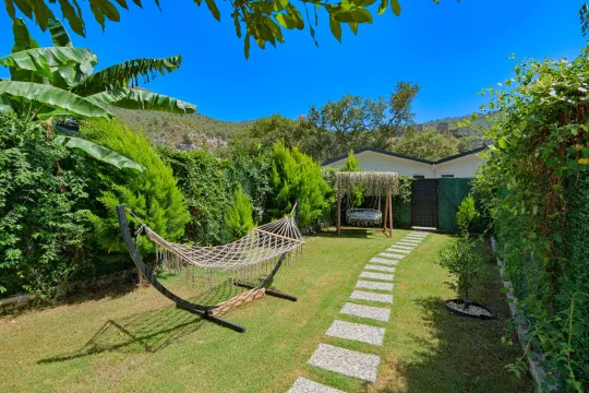 Kayaköy'ün eşsiz doğasına sırtını yaslamış; doğa içinde dingin konumu ve yemyeşil geniş bahçesiyle sakin ve huzurlu bir tatil arayan misafirlerimiz için oldukça uygun olan villa, sizlere Kayaköy'ün büyülü tarihinde kısa bir mola vaadetmektedir. Bu bağlamdan esinlenerek dizayn edilmiş bahçe alanı geniş havuz terasında sahiptir; yine havuz terasında kapasiteye uygun şezlong takımı, konforlu oturma grubu, salıncak ve barbekü bulunmaktadır. Havuz terasına açılan konforlu oturma odası, donanımlı mutfağıyla herhangi bir şeyin eksikliğini hissetmeyeceğiniz villanın, bir yatak odasında çift kişilik yatak ebeveyn banyosu ikinci yatak odasında da iki tek kişilik yatak ve ebeveyn banyosu bulunmaktadır.