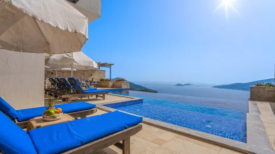 Eşsiz deniz manzarasının ve doğanın içinde modern tasarımı ile dikkatleri üzerine çeken, sevdiklerinizle birlikte güvenli ve huzurlu bir tatilin keyfini sürebileceğiniz, özenle tasarlanmış, yeşilin ve mavinin her tonu ile karşı karşıya kalacağınız villanın havuz terasında şezlong takımı, oturma grubu ve barbekü alanı bulunmaktadır. Sahip olduğu manzara ile sevdikleriniz ve ailenizle muhteşem günbatımları keyifli tatil anıları biriktirmenize olanak sunmaktadır. Aynı zamanda kapalı havuzda deniz manzarasının tadını çıkarırken, Sauna ve Türk hamamıyla tatilinize renk katabilirsiniz. Minik misafirlerimiz için oyun alanı ayrıca eğlenceli vakit geçirebilmeniz için langırt bulunmaktadır.