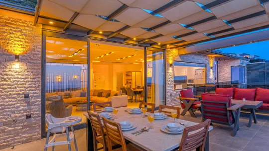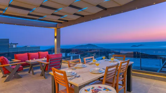 Kalkan Kördere mevkiinde bulunan villa, 3 yatak odasıyla 6 kişilik konaklama kapasitesi sunmaktadır. Doğa ve deniz manzarasına hakim, genişliği ve şıklığı ile göz dolduran villa, geniş aile ve arkadaş grupları için idealdir.
