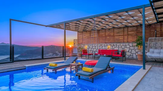 Muhteşem manzaraya karşı, güneşlenip yüzebileceğiniz havuz terasında kapasiteye uygun şezlong takımı, oturma grubu ve barbekü alanı bulunan villanın, yine havuz terasına açılan konforlu oturma odası ve tam donanımlı açık mutfağı; Bir yatak odasında çift kişilik yatak,ebeveyn banyosu ve jakuzi; ikinci yatak odasında çift kişilik yatak,ebeveyn banyosu, diğer yatak odasında iki tek kişilik yatak ve ebeveyn banyosu bulunmaktadır.