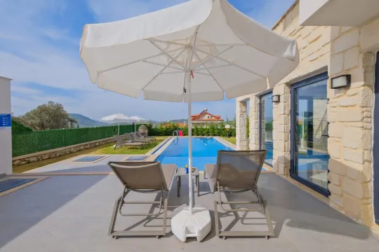 Geniş havuz terasında kapasiteye uygun şezlong takımı, oturma grubu, salıncak ve barbekü alanı bulunan villada, rahat bir tatil için her detay düşünülmüştür. Yine havuz terasına açılan konforlu oturma odası ve tam donanımlı açık mutfağı; bir yatak odasında çift kişilik yatak, ebeveyn banyosu ve jakuzi, ikinci yatak odasında çift kişilik yatak, ebeveyn banyosu ve jakuzi; üçüncü yatak odasında iki tek kişilik yatak,sauna, son olarak dördüncü yatak odasında da iki tek kişilik yatak ve ebeveyn banyosu bulunmaktadır.