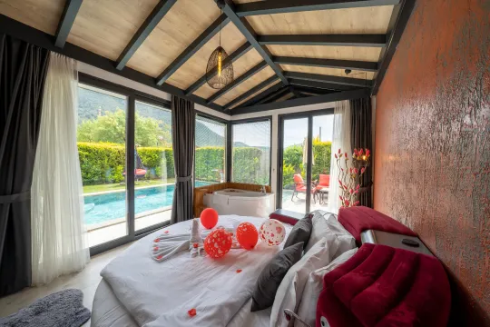 Fethiye Kayaköy mevkiinde bulunan villa 1 yatak odasıyla 2 kişi konaklama kapasitesi sunmaktadır. Çekirdek aileler ve balayı çiftleri için uygundur. Korunaklı havuz ve bahçe alanı mevcuttur.