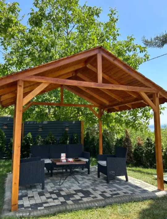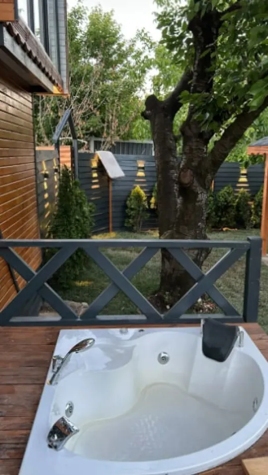 Bumuzdaki alan çardağımız, havuzumuz, jakuzimiz, ateş çukurumuz ve genelimiz sizi bekliyor. Evimizde ve bahçemizde kimse sizi göremez ve tamamen size özeldir.