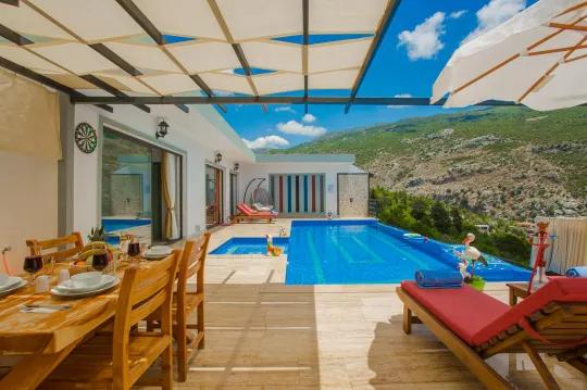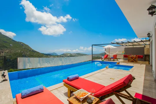 Kalkan İslamlar mevkiinde bulunan, 2 yatak odalı ve 4 kişilik konaklama kapasitesine sahip doğa içerisinde konumlandırılmış ve panoramik deniz manzarasına sahip bir villadır.