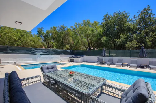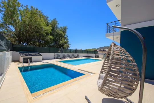 Genişliği ve ferahlığı ile göz dolduran villa bünyesinde kapasiteye uygun mobilyalar, ihtiyacınız olan tüm araç-gereçleri barındıran Amerikan tarzda, modern mutfak ve üç adet yatak odası mevcuttur. Konforunuz odaklı tasarlanan villanın tüm yatak odalarında klima ve özel kullanım banyo/wc bulunmaktadır. Villanın suit yatak odalarından birinde günün yorgunluğunu atmanızı ve tatilin keyfini çıkarmanızı sağlayacak bir adet jakuzisi de mevcuttur. Villamızın aynı zamanda yerden ısıtması da bulunmaktadır. Villanın geniş havuz terası ve müstakil bahçesinde yine kapasiteye uygun şezlong ve şemsiye, oturma alanı, salıncak, yemek masası ve barbekü alanı mevcuttur. Villanın havuzu ısıtma sistemli olup, kış aylarında ısıtma sistemi fiyata dahildir.