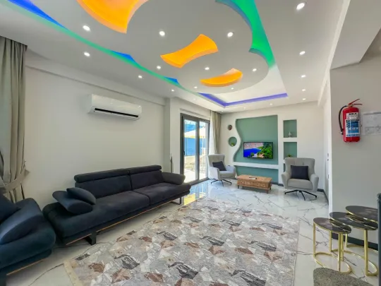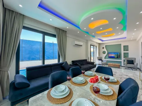 Havuz terasından doğrudan geçilebilen geniş ve aydınlık oturma odası, modern ve konforlu bir şekilde dekore edilmiştir. Burada rahat koltuklarda dinlenebilir, televizyon izleyebilir veya sevdiklerinizle keyifli vakit geçirebilirsiniz. Oturma odasıyla bağlantılı olan tam donanımlı açık mutfak ise, tatiliniz boyunca ihtiyaç duyabileceğiniz her türlü araç gereci sunmaktadır. Kendi yemeklerinizi hazırlama özgürlüğüne sahip olacağınız bu modern mutfakta, sevdiklerinizle birlikte lezzetli sofralar kurabilirsiniz.