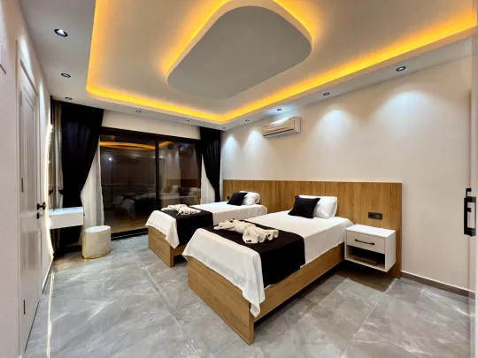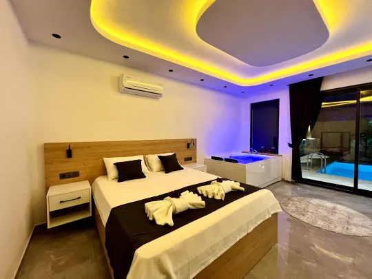 İhtiyaçlarınızı karşılayacak donanıma sahip oturma odası ve donanımlı mutfağı, bir yatak odasında çift kişilik yatak, ebeveyn banyosu ve jakuzi, diğer yatak odasında iki tek kişilik yatak bulunmaktadır. Plaja ve merkeze kolay ulaşabileceğiniz konumuyla, balayı misafirlerinin huzurlu bir tatil için seçtikleri villalardan biri olan villa, konforunuz düşünülerek tasarlanmış olup, herhengi bir şeyin eksikliğini hissetmeyeceğiniz donanımıyla sizleri memnun bırakacaktır.