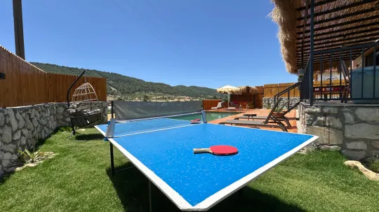 Geniş havuz ve bahçe alanına sahip villada, kapasiteye uygun oturma alanı, şezlong takımı, barbekü; havuz terasına açılan konforlu oturma odası, ihtiyaçlarınızı karşılayacak donanıma sahip şık mutfağı bulunmaktadır. Bir yatak odasında çift kişilik yatak ve ebeveyn banyosu; ikinci yatak odasında da iki tek kişilik yatak ve ebeveyn banyosu mevcuttur. Doğa içinde, huzurlu sakin bir tatil vaadeden, bulunduğu konumdan esinlenilen detaylara sahip olan villada, keyifli bir tatil deneyimlemeniz için her şey düşünülmüştür.