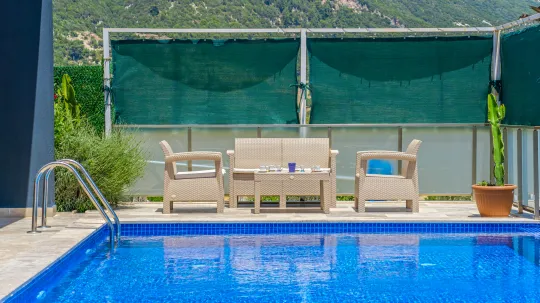 Kalkan Sarıbelen mevkiinde bulunan villa 2 yatak odasıyla 4 kişilik konaklama kapasitesi sunmaktadır. Korunaklı bahçe ve havuz alanına sahiptir. Çekirdek aile ve arkadaş grupları için uygundur.