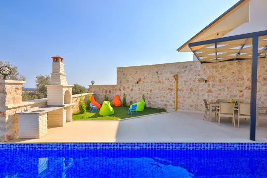 Taş mimariye ve göz dolduran genişliğe sahip villa bünyesinde kapasiteye uygun mobilyalar, ihtiyacınız olan tüm araç-gereçleri barındıran, geniş mutfak ve 3 adet yatak odası mevcuttur. Konforunuz odaklı tasarlanan villanın tüm yatak odalarında klima ve özel kullanım banyo/wc bulunmaktadır. Villanın 2 ebeveyn suit yatak odasında günün yorgunluğunu atmanızı ve tatilin keyfini çıkarmanızı sağlayacak 1'er adet jakuzisi de mevcuttur. Villanın özel havuz alanı ve müstakil bahçesinde yine kapasiteye uygun şezlong ve şemsiye, oturma alanı, yemek masası ve barbekü alanı bulunmaktadır.