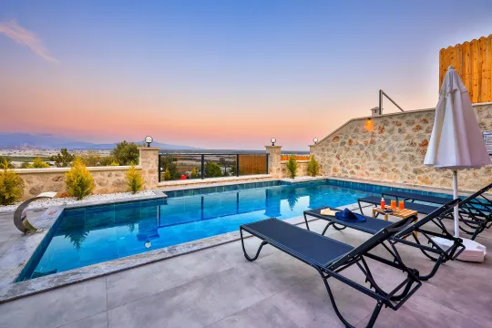 Taş mimariye ve göz dolduran genişliğe sahip villa bünyesinde kapasiteye uygun mobilyalar, ihtiyacınız olan tüm araç-gereçleri barındıran, geniş mutfak ve 2 adet yatak odası mevcuttur. Konforunuz odaklı tasarlanan villanın tüm yatakları klima ve özel kullanım banyo/wc'si bulunmaktadır. Villanın 2 ebeveyn suit yatak odasında da günün yorgunluğunu atmanızı ve tatilin keyfini çıkarmanızı sağlayacak 1'er adet jakuzisi de mevcuttur. Villanın özel havuz alanı ve müstakil aralığı yine kapasiteye uygun yayın ve şemsiye, oturma alanı, yemek masası ve perde alanı bulunmaktadır.