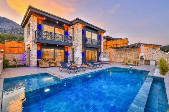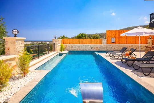 Taş mimariye ve göz dolduran genişliğe sahip villa bünyesinde kapasiteye uygun mobilyalar, ihtiyacınız olan tüm araç-gereçleri barındıran, geniş mutfak ve 2 adet yatak odası mevcuttur. Konforunuz odaklı tasarlanan villanın tüm yatakları klima ve özel kullanım banyo/wc'si bulunmaktadır. Villanın 2 ebeveyn suit yatak odasında da günün yorgunluğunu atmanızı ve tatilin keyfini çıkarmanızı sağlayacak 1'er adet jakuzisi de mevcuttur. Villanın özel havuz alanı ve müstakil aralığı yine kapasiteye uygun yayın ve şemsiye, oturma alanı, yemek masası ve perde alanı bulunmaktadır.