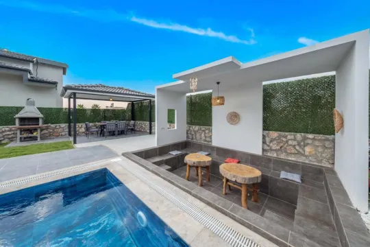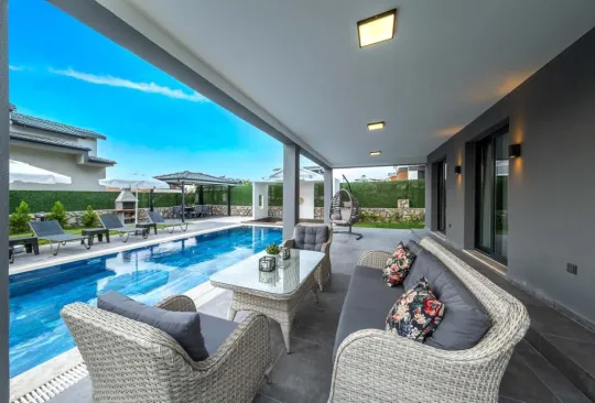 Korunaklı havuz terasında kapasiteye uygun şezlong takımı, oturma grubu, salıncak ve barbekü alanı bulunan villada, rahat bir tatil için her detay düşünülmüştür. Yine havuz terasına açılan konforlu oturma odası ve tam donanımlı açık mutfağı; bir yatak odasında çift kişilik yatak,jakuzi ebeveyn banyosu, ikinci yatak odasında çift kişilik yatak ve ebeveyn banyosu,Üçüncü yatak odasında iki tek kişilik yatak bulunmaktadır.Barbekü, masa, sandalyeler, şezlonglar ve şemsiyeler bahçe keyfini sınırsız yaşamanıza imkan tanıyor. Salonunda oturma grubu, televizyon, eşyalar bulunurken, tüm odalar için ayrı klima imkanı var.