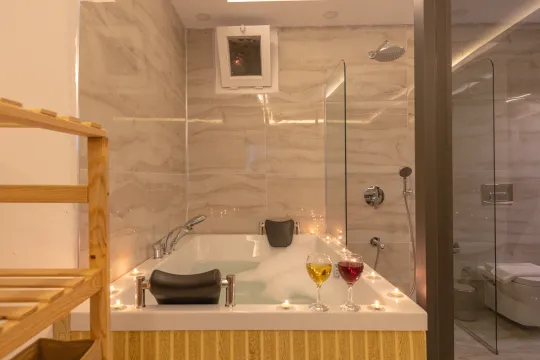 Geniş bahçe ve havuz alanına sahip villada, kapasiteye uygun oturma alanı, şezlong takımı, barbekü; havuz terasına açılan konforlu oturma odası; ihtiyaçlarınızı karşılayacak donanıma sahip şık mutfağı bulunmaktadır. Birinci yatak odasında bir çift kişilik yatak, tv, jakuzi ve ebeveyn banyosu yer almaktadır. İkinci yatak odasında da iki tek kişilik yatak, tv, ebeveyn banyosu mevcuttur.