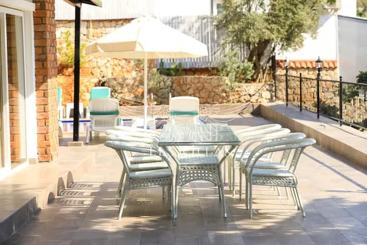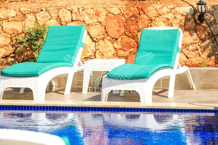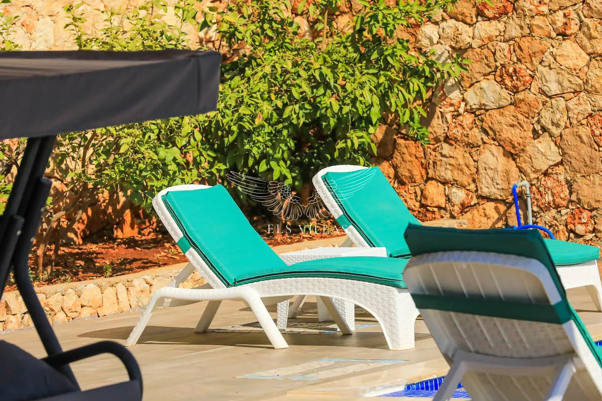 Dış mekanda yer alan özel yüzme havuzu ve geniş güneşlenme terası, misafirlerin keyifli vakit geçirebilmesi için ideal alanlar sunar. Havuz başında dinlenebileceğiniz şezlonglar, açık yemek alanı ve oturma grubu ile konfor dolu bir tatil sizleri bekliyor.