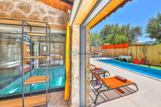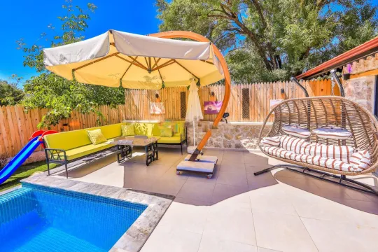 Kalkan Bezirgan mevkiinde bulunan villa 2 yatak odasıyla 4 kişilik konaklama kapasitesi sunmaktadır. Korunaklı havuz alanına sahip villa balayı çiftleri ve geniş aileler için uygundur.