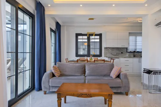 Salon : Lüks ve konforlu salon içerisinde oturma grubu, LCD TV, klima ve havuz terasına direkt çıkış yer almaktadır.