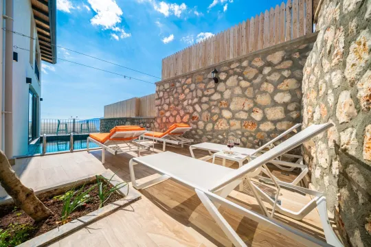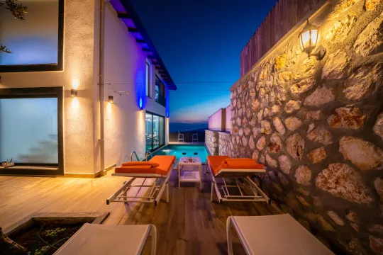 Muhteşem manzaraya karşı, güneşlenip yüzebileceğiniz havuz terasında kapasiteye uygun şezlong takımı, oturma grubu ve barbekü alanı bulunan villanın, yine havuz terasına açılan konforlu oturma odası ve tam donanımlı açık mutfağı; bir yatak odasında çift kişilik yatak ebeveyn banyosu ve jakuzi; diğer yatak odasında çift kişilik yatak ve ebeveyn banyosu bulunmaktadır.