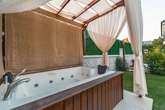 Bahçe: Güneşlenme şemsiyeleri, şezlonglar, jakuzi, yemek masası, salıncak ve barbekü bulunmaktadır.